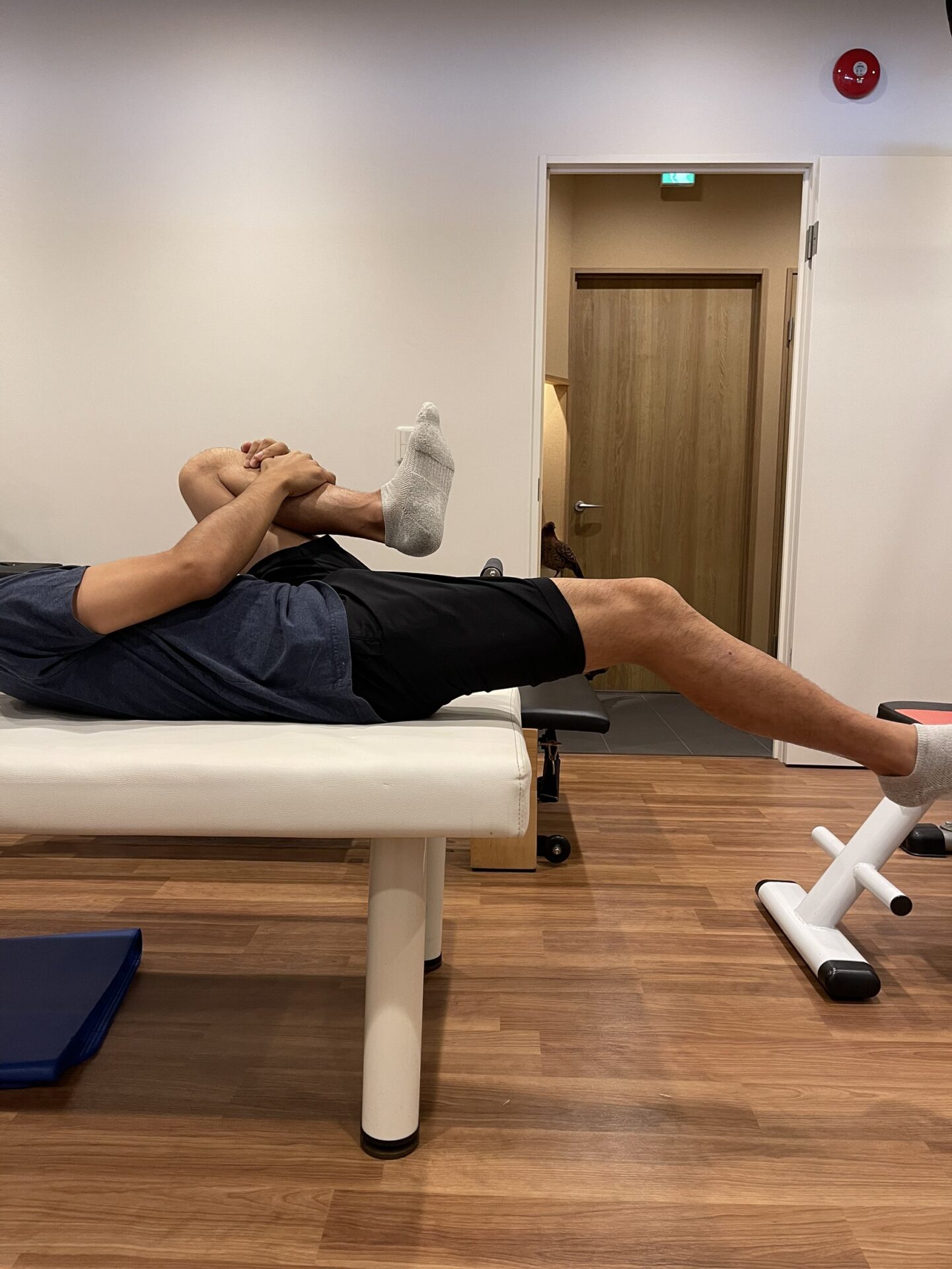 - 片膝を胸に抱える。反対の脚は力を抜いて垂らす。